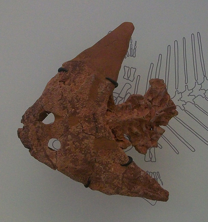ASPETTO: ma che aspetto aveva il Diplocaulus? Anche qui ci sono duie scuole di pensiero. Chi vuole le corna libere, chi invece pensa che le stesse fossero unite al resto del corpo da lembi di pelle posteriori che facessero conferire all’animale un aspetto simile alla razza odierna. Questa seconda ipotesi pare essere suffragata da uno scheletro esposto al Museo di Scienze Naturale dell’Università del Michigan, in cui impronte di pelle parrebbero essere presenti ad unire le estremità delle corna laterali al resto del corpo.